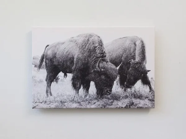 Canvas Print Bison – A note from the photographer – This moment was captured at Teddy Roosevelt National Park in western, North Dakota. A herd of buffalo roam the North Dakota prairie badlands in the background as two bulls face off in the foreground.