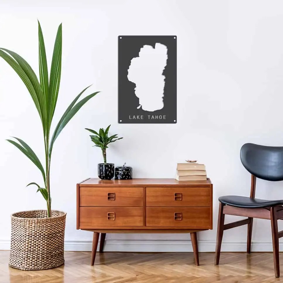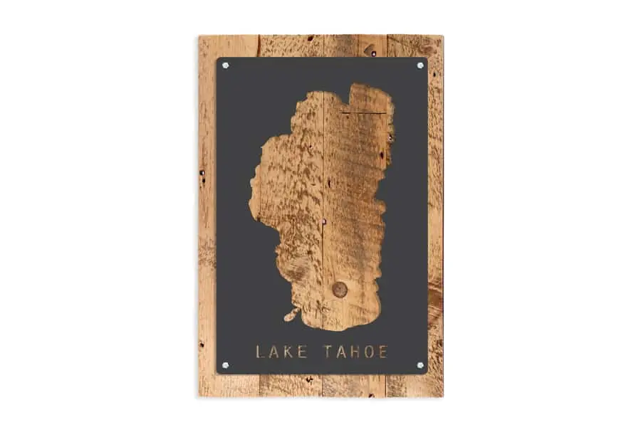 This Lake Tahoe Sign is a modern twist on your old geography map – the perfect map wall art for any lake home or office. Handmade with reclaimed wood, each lake sign is laser-cut from metal for an industrial wall art piece.