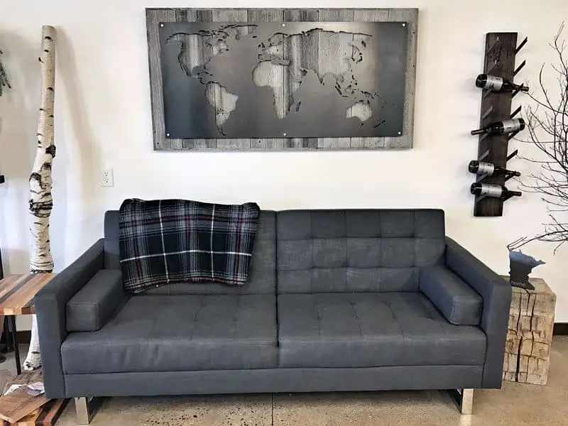-Built from laser cut metal and reclaimed wood with a unique weathered gray patina